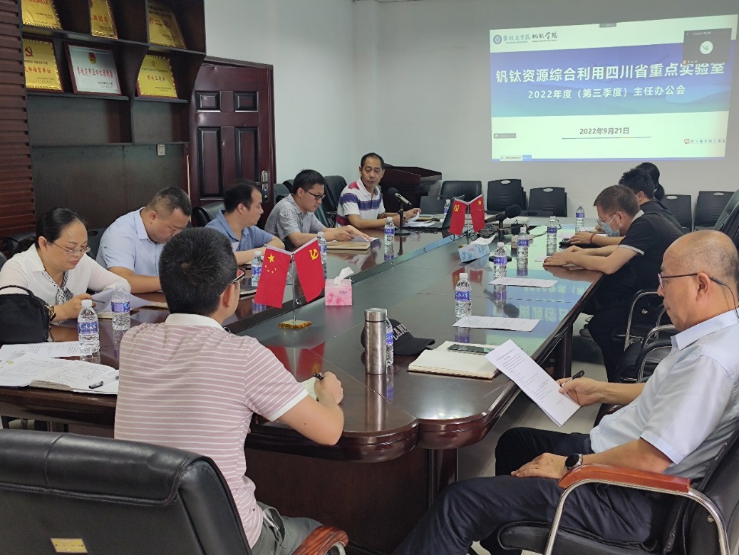 2022年9月21日,钒钛资源综合利用四川省重点实验室2022年度第三次主任办公会在砺志楼303室成功召开。实验室拟任主任蒋志强教授、副主任马兰教授、各研究方向学科带头人和实验室管理人员参会,会议由蒋志强教授主持。
