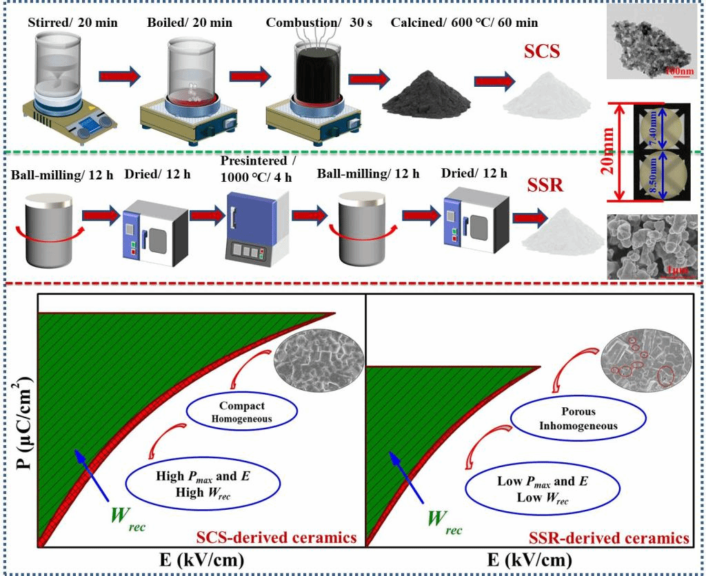 该研究首次利用溶液燃烧法(SCS)替代传统固相法(SSR)制备了Sr0.7Bi0.2TiO3(SBT)介电储能陶瓷,降低制备能耗的同时大大缩短了制备周期。采用该方法制备的SBT介电陶瓷,晶粒细小,结构和化学均匀度高,具有更高的绝缘电阻率、激活能和击穿电场。利用此方法制备的SBT陶瓷电容器,获得超高的临界电场,储能密度和能量释放效率(543kV/cm、5.21 J/cm3 和 91.55%),同时具有超高的硬度~7.80 GPa。该研究表明,SCS制备的介电陶瓷在储能方面具有巨大的应用潜力。