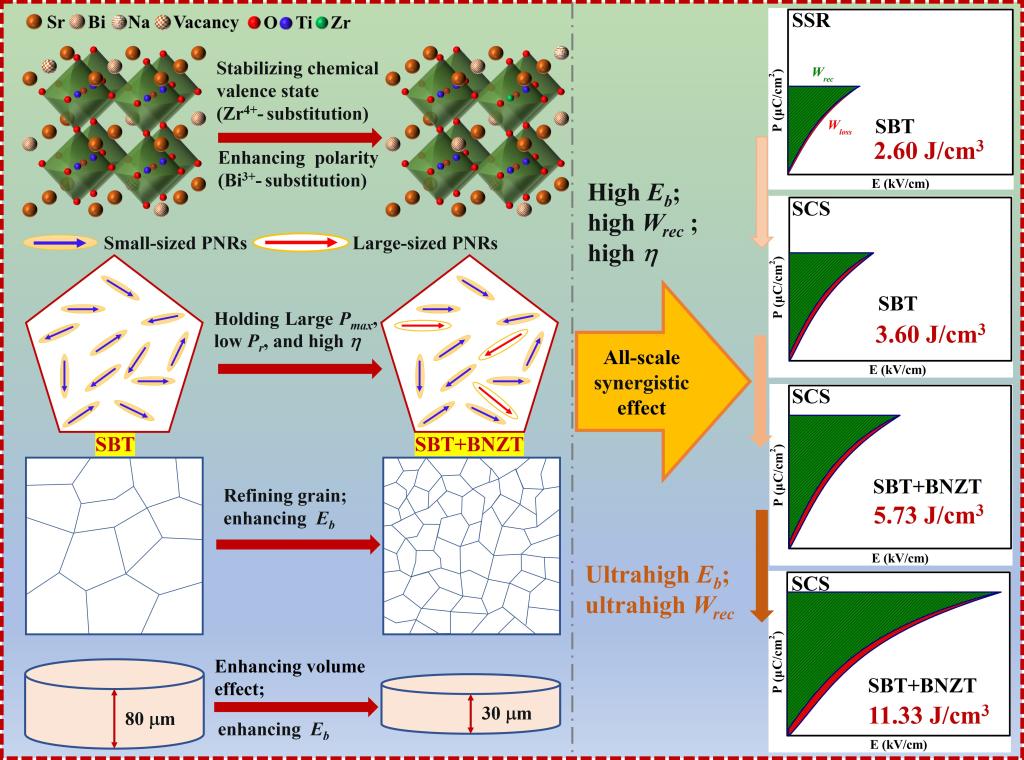 电介质陶瓷电容器较低的能量密度一直是其在先进电子系统中应用的主要挑战。为解决这一问题,该工作创新性地提出利用原子尺度掺杂、纳米畴工程、亚微米晶粒尺寸调节和样品厚度调节等手段,通过全尺度架构来提高SrTiO3基陶瓷的储能性能。与其他单尺度或多尺度设计相比,这种全尺度协同设计实现了卓越的储能性能,首次在SrTiO3基陶瓷中实现超过10J/cm3的超高能量密度(达到11.33 J/cm3)。这种全尺度架构策略显示出巨大的潜力,为优化电介质电容器的储能性能提供了一种新的途径。