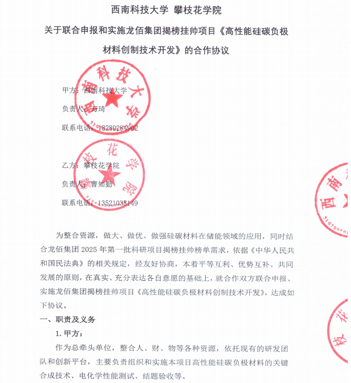 近日,公司曹知勤博士团队携手西南科技大学万琦教授,凭借扎实的科研实力,经过材料申报、答辩等环节,在激烈的竞争中脱颖而出成功揭榜龙佰集团“揭榜挂帅”科技攻关项目—《高性能硅碳负极材料创制技术开发》,项目总经费达100 万元,实现公司在企业“揭榜挂帅”重大科研项目上新突破。