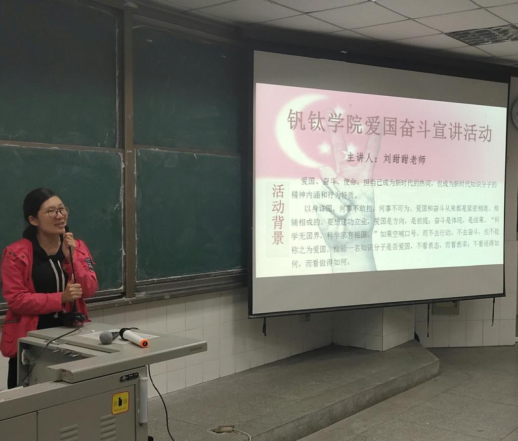 宣讲伊始,刘甜甜围绕“爱国、奋斗、使命、担当”这几个新时代的热词为大家一一讲述,点明这几个热词已新时代知识分子的精神内涵。刘甜甜告诉大家,国是千万家,爱国和奋斗一直都是紧密相连的。作为新青年的我们更应承担自己的责任,为祖国的富强而奋斗。在活动最后,刘甜甜引用梁启超的话“少年胜于欧洲则国胜于欧洲,少年雄于地球则国雄于地球”来激励钒钛学子为祖国的发展而奋斗。