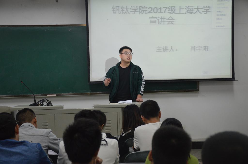 首先由沙彩云为大家说明了本次会议的目的,接着就是已在上海大学学习了一年的肖宇阳向同学们分享自己在上海大学学习的经历。肖宇阳首先展示了自己在上海大学留下的照片,让同学们对上海大学的校园有所了解,接着讲述了自己在上海大学的求学经历和感想。最后,安昀解答了同学们对上海大学联合培养班存在的问题。