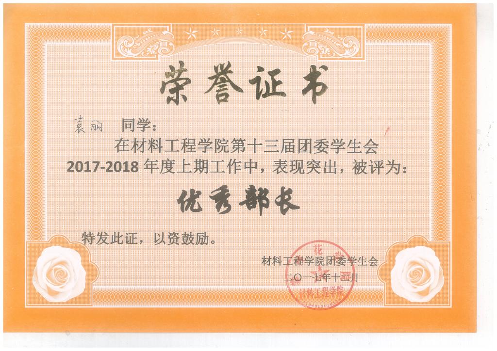 满腔热情服务他人。在员工工作的岗位上兢兢业业,曾担任班级生活委员,组织策划班级活动,为班级的建设贡献自己的力量。不止步于班级,在公司担任院员工会文艺部副部长,服务于公司甚至全校师生。由于表现优异,曾获校级优秀共青团员,院级优秀部长。