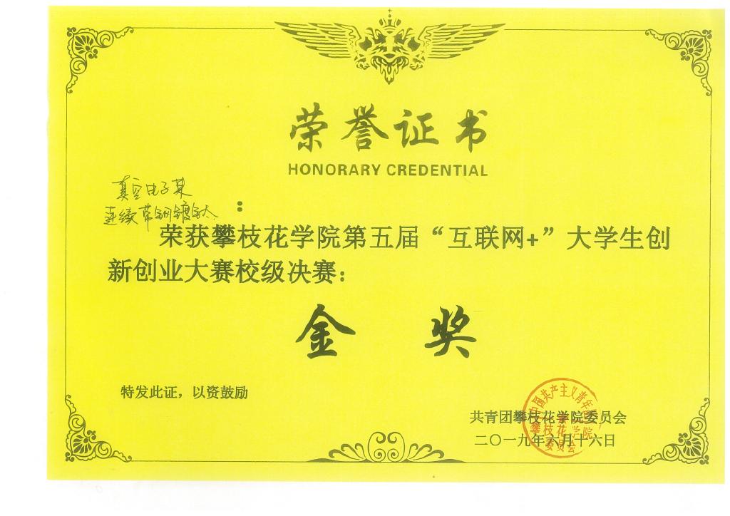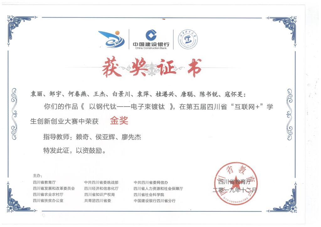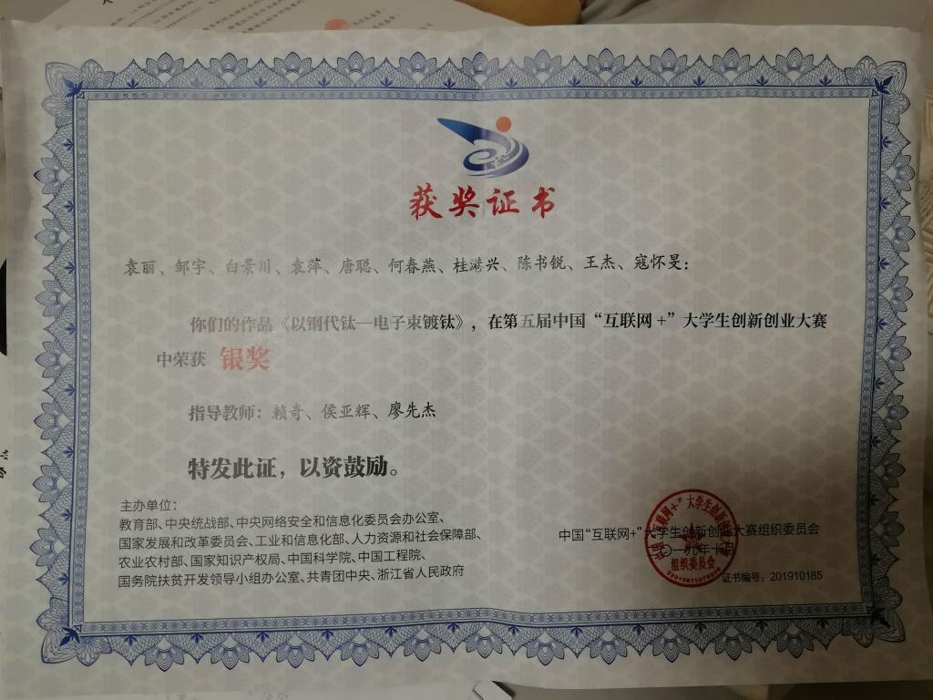 不忘创新创业。作为一名新时代的青年,我不愿停歇自己的脚步,而愿与时俱进,在创新创业的路上追求更高的目标。担任电子束镀钛项目负责人,成立了攀枝花永稀科技有限公司并担任法人兼董事长。参加第五届互联网+比赛获国家级银奖、省级金奖、校级金奖,打破了yl1111永利集团建校以来的历史,获得历史最佳成绩。我担任石墨烯二氧化钛复合材料项目负责人,成立了攀枝花烯盛科技有限责任公司并担任董事长,参加第四届互联网+比赛获省级铜奖、校级优秀奖。参加第一届材料设计大赛获省级优秀奖,参加攀枝花市创新创业大赛获市级三等奖。