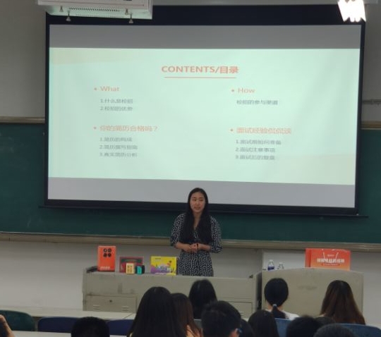 6月4日晚7:40,公司在二教2-2开展以“校招全攻略”为主题的就业指导大会,由猿辅导老师梁漫莎担任主讲人,员工科科长李宏、18级辅导员王新宇出席,部分18级同学参加。