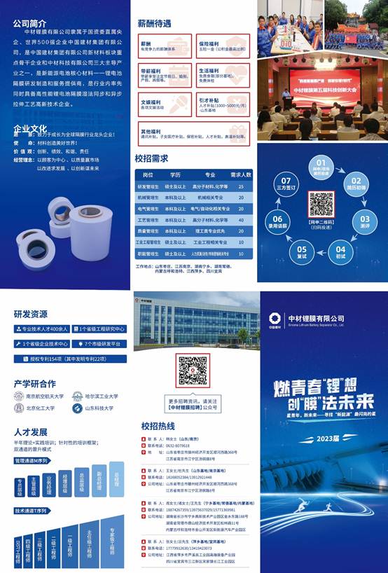 中材锂膜有限公司,成立于2016年3月,隶属于中国建材集团,是由中材科技股份有限公司、南京玻璃纤维研究设计院有限公司和滕州盈科合众投资管理中心共同出资组建的央企控股混合所有制经济体,公司注册资金3亿元,专业从事高性能锂电池隔膜的研发、生产、销售及技术服务。主要产品为5~20μm湿法双向同步拉伸隔膜及各类涂覆隔膜,应用于新能源汽车动力电池、3C消费电池、储能电池等领域。HR从公司地理位置、规模、公司产品和技术实力、企业文化、员工发展、培训体系、校招岗位和薪酬待遇等方面向毕业生进行了详细的宣讲及并与同学们进行了现场交流,针对毕业生关注的问题进行了耐心细致的解答。会后共有20余名毕业生向公司投递了简历并在现场接受面试。2023届毕业生辅导员参与了此次专场招聘会并做积极协调。