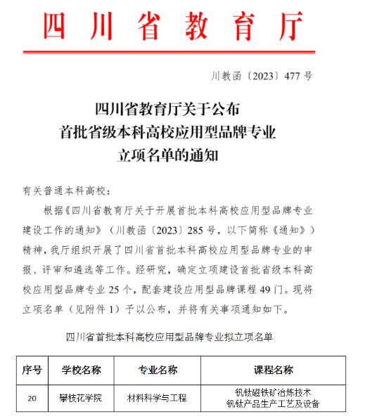 近日,四川省教育厅公布了首批省级本科高校应用型品牌专业及课程立项名单,经专家通讯评审、会议评审和厅长办公会审议等程序,公司yl1111永利集团料科学与工程专业获批首批省级本科高校应用型品牌专业,为公司唯一入选专业。同时,“钒钛磁铁矿冶炼技术”和“钒钛产品生成工艺及设备”两门课程被列入应用型品牌课程建设名单。