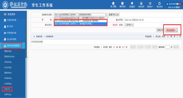 第二步:在左侧选择“奖助评优申请管理”中“常规评优”,然后找到申报的对应批次,点击“申请此奖项”