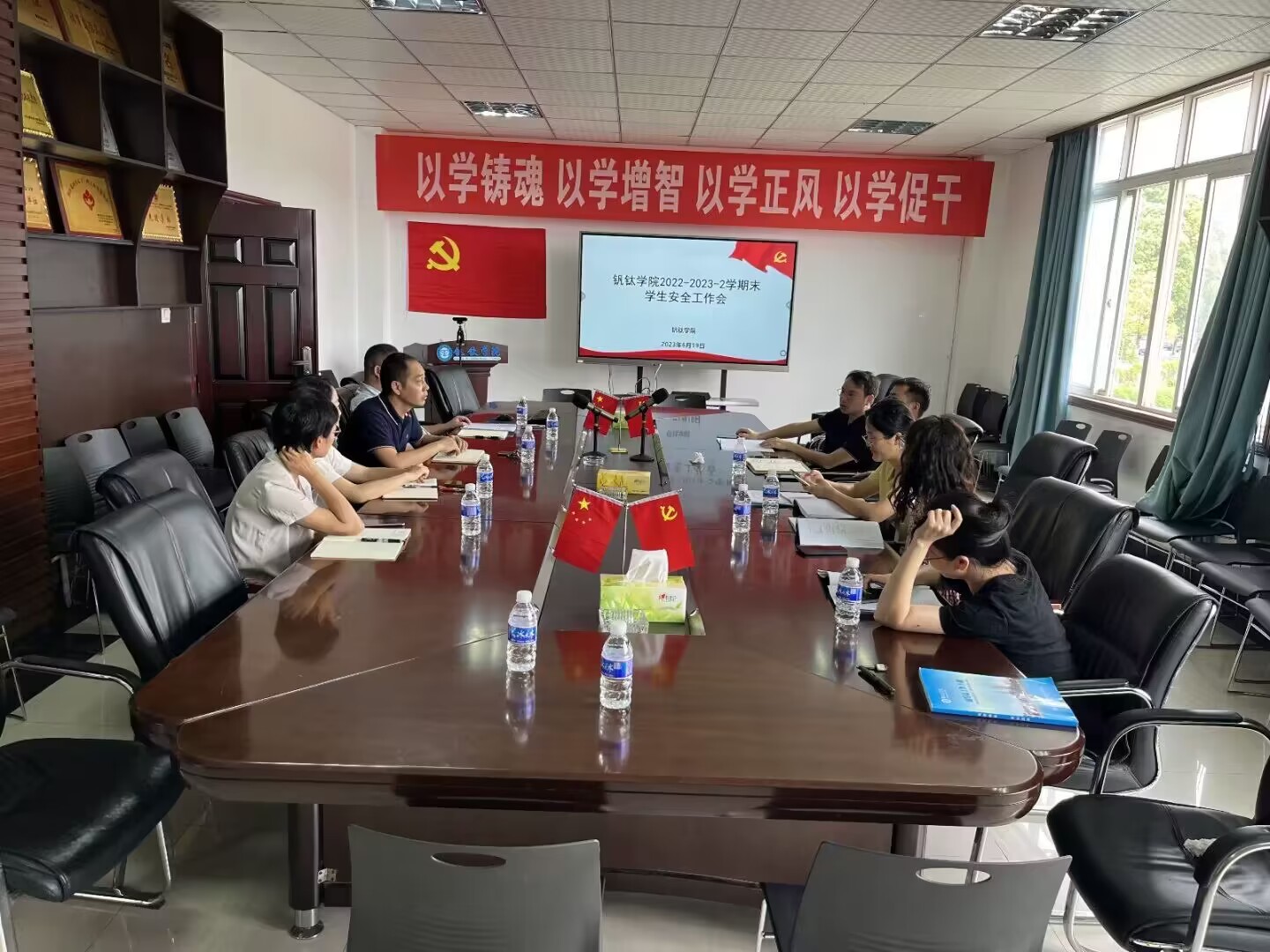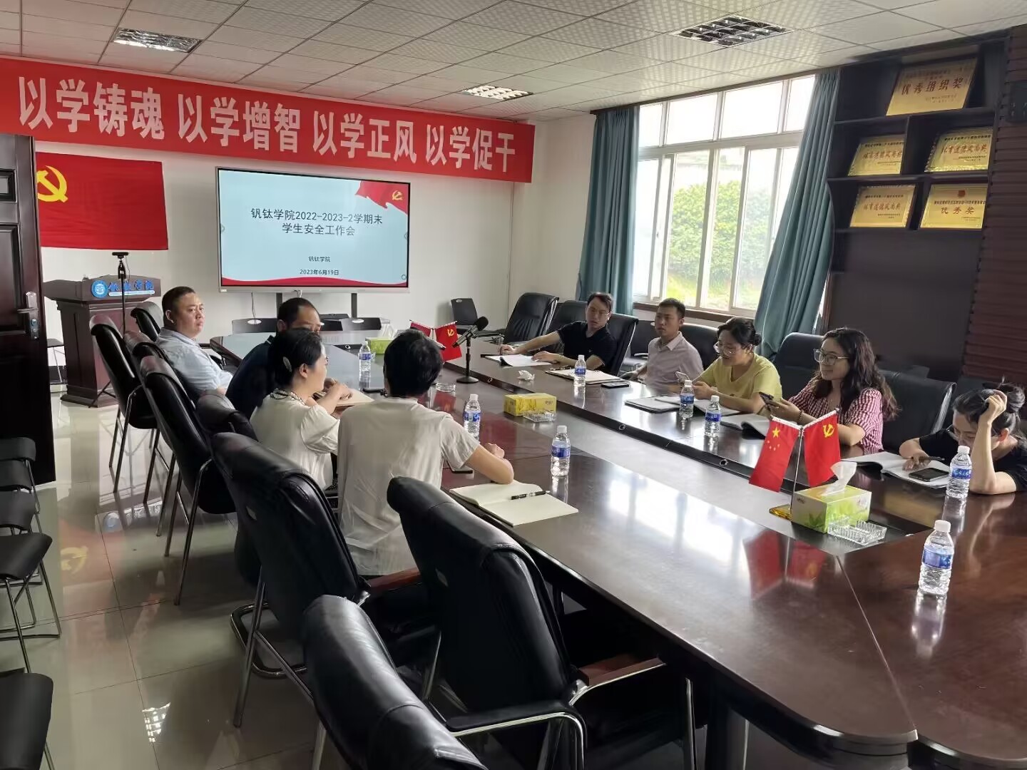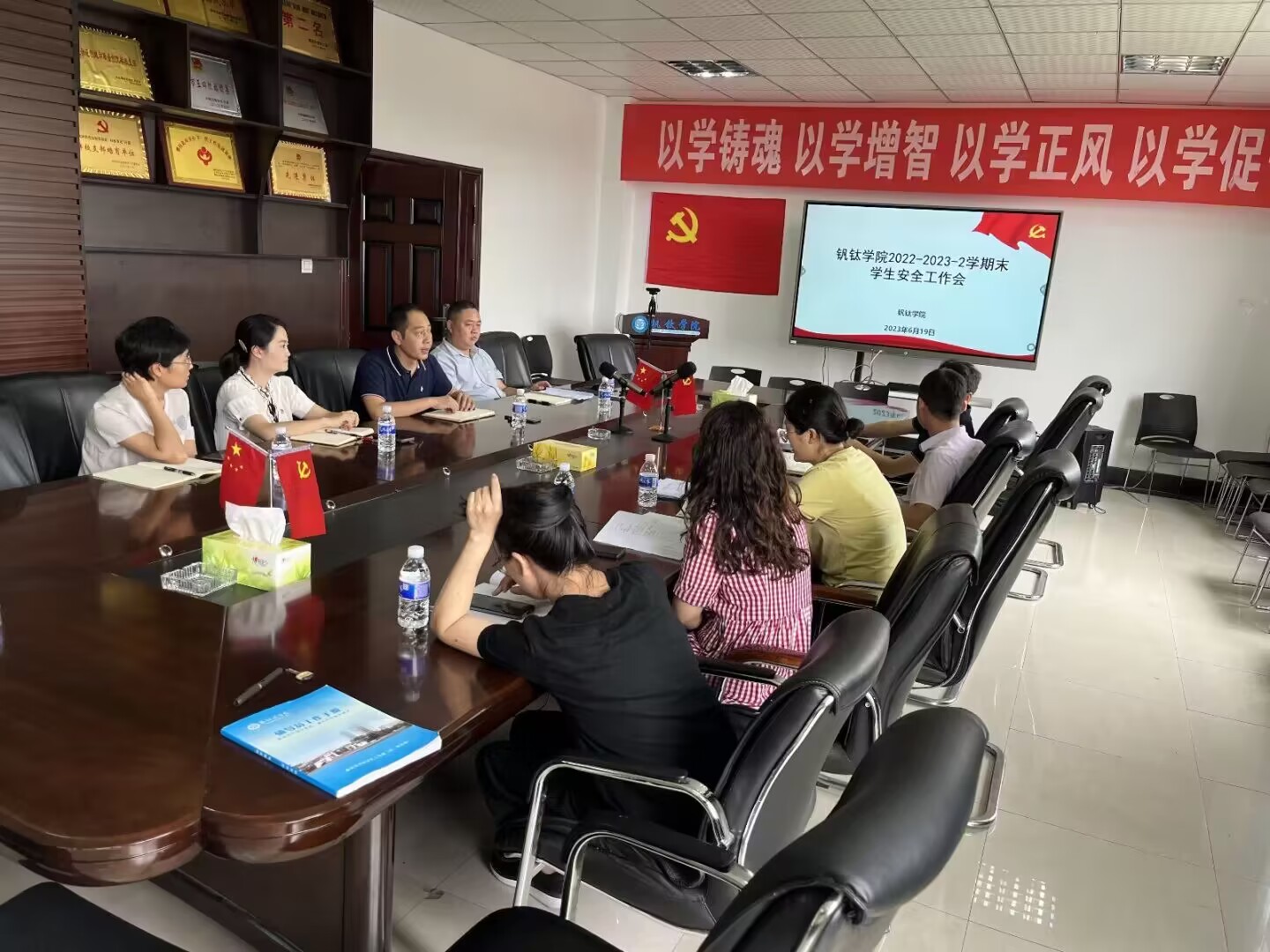 6月19日,公司于砺志楼进行了2022—2023-2学期末员工安全工作会议。公司党委书记王鹃,经理蒋志强,党委副书记、纪委书记蒲洪,副经理吴恩辉,副经理李俊翰以及员工科全体老师参加。
