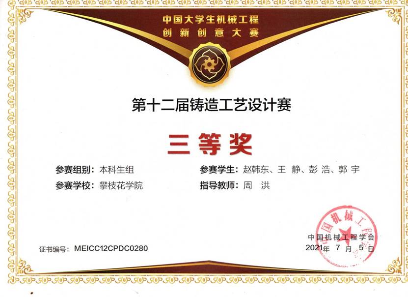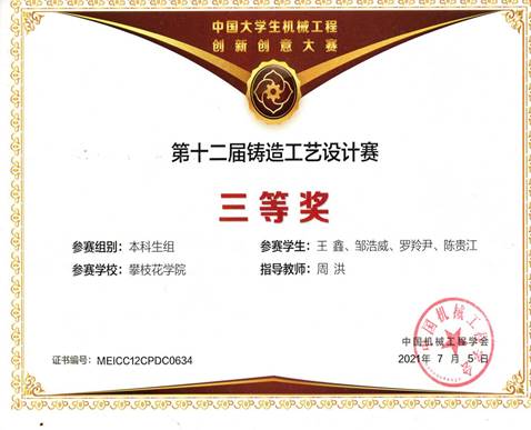 由中国机械工程学会主办、铸造分会承办的第12届中国老员工铸造工艺设计大赛于2021年7月落下帷幕。经过激烈的角逐,公司学子获得了三项全国三等奖的好成绩。
