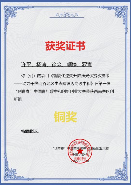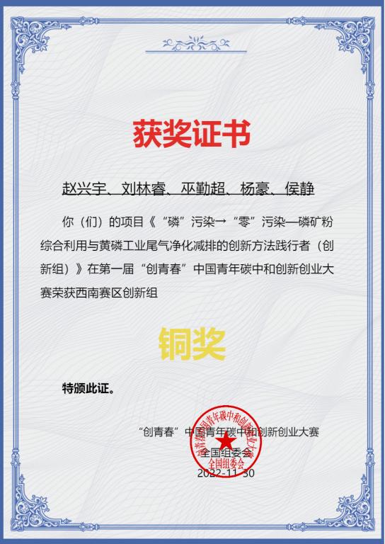 第一届“创青春”中国青年碳中和创新创业大赛于2022年12月初评审结束,公司新能源科学与工程、冶金工程专业的刘源裴、梁俊杰、许平、赵兴宇、曾欣等员工在指导教师张士举、徐众、侯静和钟璨宇的带领下,斩获西南赛区创新组银奖1项、铜奖3项、优胜奖1项。