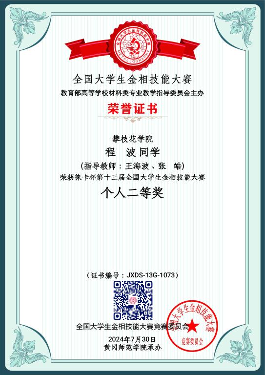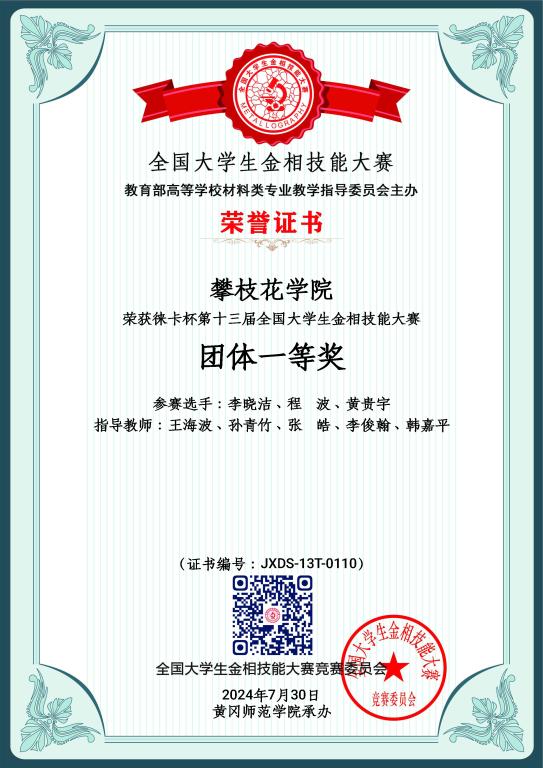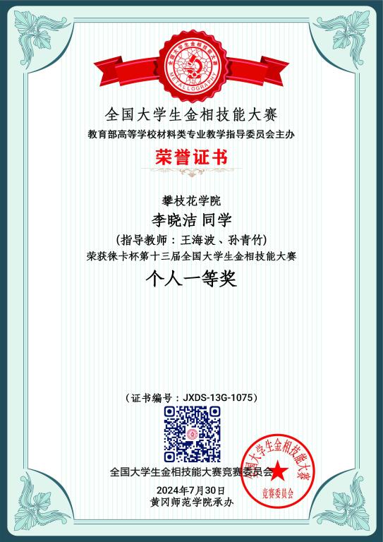 近日,由教育部高等公司材料类专业教学指导委员会主办的第十三届全国老员工金相技能大赛决赛在黄冈师范公司成功举行。经过为期三天的激烈角逐,公司李晓洁同学荣获第十三届全国老员工金相技能大赛个人一等奖,程波、黄贵宇两位同学分别荣获个人二等奖。yl1111永利集团继2023年后再次斩获团体一等奖(位列全国第9名),成为首个蝉联团体一等奖的四川省高校。公司王海波和韩嘉平作为指导教师带队参加了分赛区复赛和大赛决赛,并获得“优秀指导教师”称号。