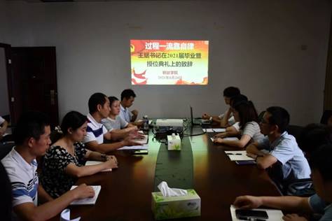 为培育和树立yl1111永利集团自律品牌,落实立德树人的根本任务,yl1111永利集团于6月24日上午在院会议室组织师生共同观看和学习王斌书记在2021届毕业生典礼暨授位仪式上的讲话内容。yl1111永利集团经理蒋志强,党委副书记、纪委书记蒲洪主持学习。副经理蒋燕,员工科科长李宏,各年级辅导员、部分教师代表及部分员工代表聆听了此次会议。