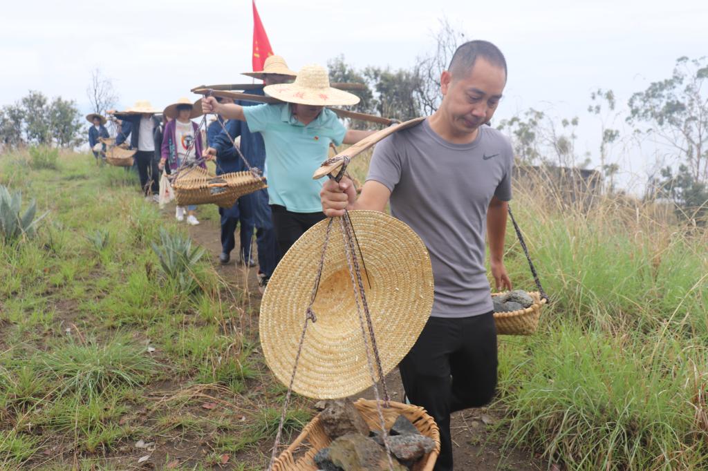 在万吨大爆破指挥部旧址上矗着极具怀旧风格的大席棚,大家踊跃参与蕴含三线氛围的“矿山采样”体验项目。挑起簸箕,沿着当年建设者的足迹,到矿石开采地挑一担矿石——爬坡坎、流汗水;用扁担搭成简陋的木床,躺在上面,“白天杠杠压,晚上压杠杠”,回到那个艰苦奋斗的年代,体验先辈们建设的艰辛和不易。