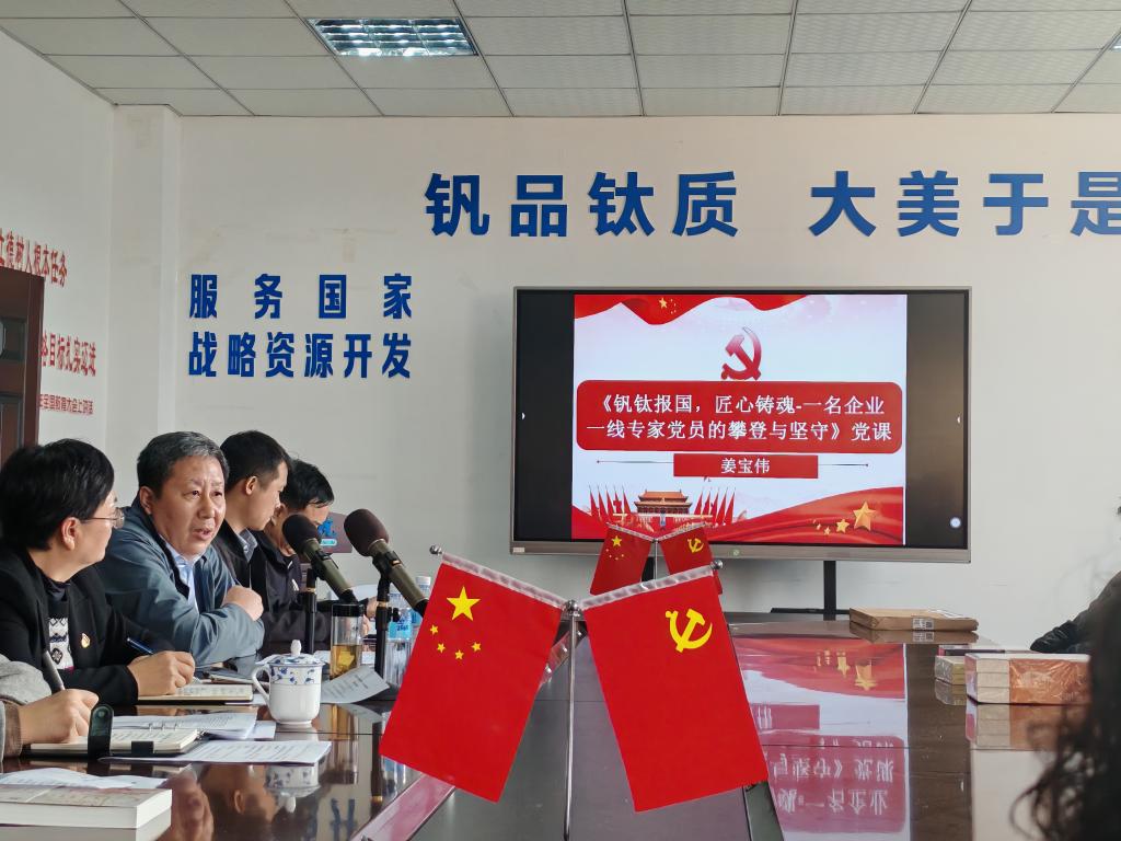 在专题党课环节,攀钢钛金属公司二级专家党员姜宝伟以《钒钛报国,匠心铸魂——一名企业一线专家党员的攀登与坚守》为题,结合自身科研实践,分享了钛金属领域“卡脖子”技术攻关的奋斗历程,阐述了党员在科技创新中的示范引领作用。他还围绕“中国制造2025”等国家战略,深入分析了钒钛产业发展趋势,并鼓励青年党员将个人理想融入国家发展大局。