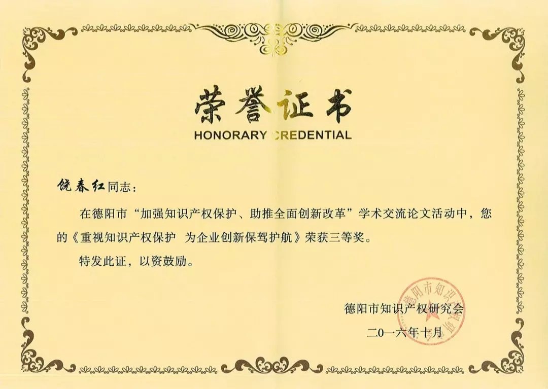 2016年10月独著《重视知识产权保护为企业创新保驾护航》论文,在德阳市“加强知识产权保护,助推全面创新改革”学术交流活动中荣获三等奖,并刊登于2016年德阳市创新驱动系列学术交流文集。