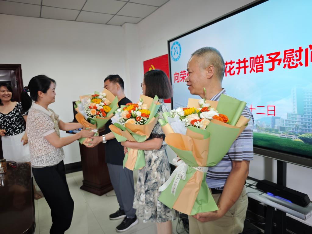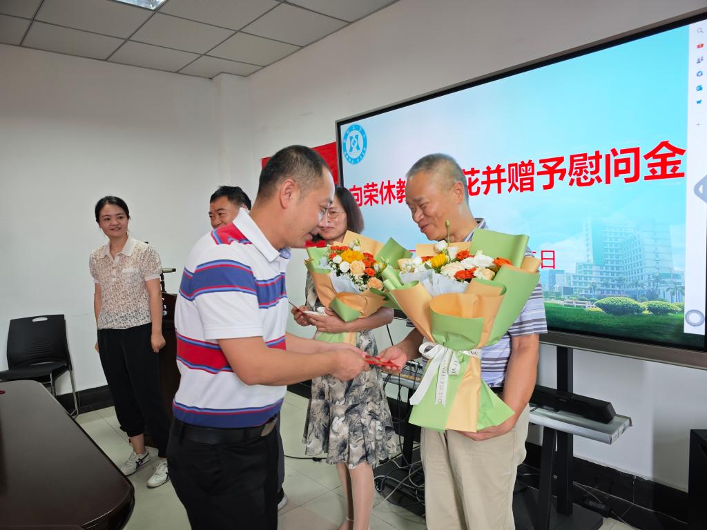 经理蒋志强代表公司对三位荣休教师表达了诚挚的感谢和美好祝愿。同时也希望三位教师能够退休不退群,继续关注和支持公司高质量发展,在人才培养、团队建设、科学研究等方面积极建言献策,继续发光发热。院领导为荣休教师献花并赠予慰问金。