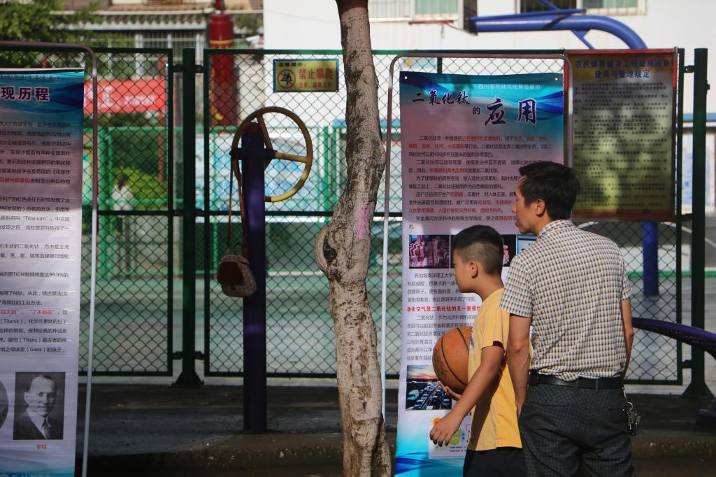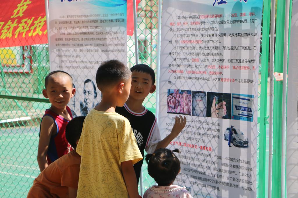 此次活动一方面为了更好地让广大攀枝花市市民了解全球钒钛资源分布,了解钒钛产品加工工艺流程,了解钒钛科技知识和钒钛文化知识,以及了解身边的钒钛产品;另一方面通过填写钒钛知识调查问卷,讲解钒钛科技知识及发放钒钛科普宣传资料的方式,增进渔门镇广大群众对攀枝花市丰富的钒钛资源的了解。图2-图5为钒钛文化知识和钒钛科技知识展板宣传照,此次宣传活动吸引了大量当地居民的关注,既有渴望知识的小朋友,也有刚放假的中员工,还有当地的居民,宣传小队队员们仔细地讲解钒钛的发现史、钒钛的开发史、攀枝花钒钛磁铁矿的艰辛开发历程、涉钒涉钛的主要生产生活产品等。图6、图7位宣传小队队员进行问卷调查。