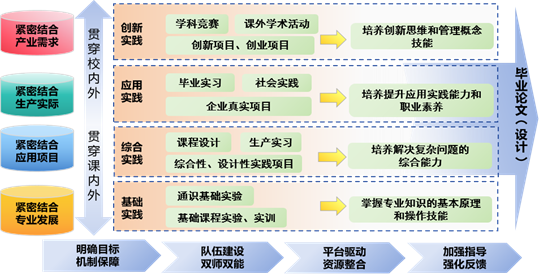 教学体系 精心打造实践教学体系,以实验教学为根基,融合虚拟仿真,强化实习实训,并与毕业论文(设计)环节紧密相连,同时积极开展创新实践活动,实现各个教学环节的有机衔接。持续深化“培养动手能力和创新精神”的实践育人理念,推进实践教学综合改革。紧密结合专业发展、应用项目、生产实际与产业需求,完善多维度质量保障机制,构建“基础实践-综合实践-应用实践-创新实践”四层次贯穿式实践教学体系。