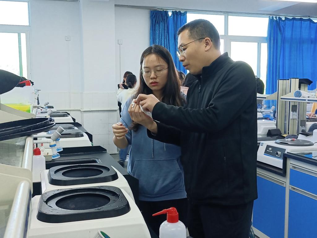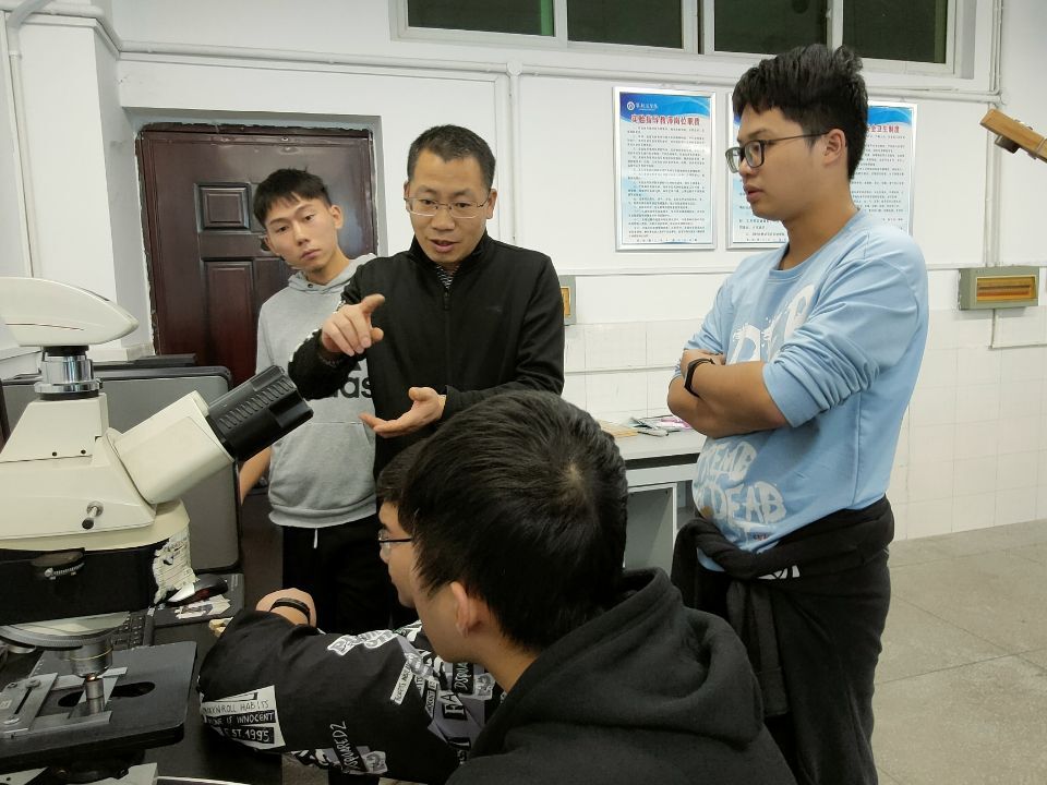 王老师指导员工观察和分析制备的金相样品