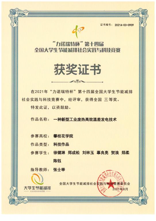 “力诺瑞特杯”第十四届全国老员工节能减排社会实践与科技竞赛于2021年4月份启动,共吸引全国521所高校参加。公司yl1111永利集团员工徐健淋、郑成松、刘林玉、辜良亮、贺浪、郑柔和陈钰以作品“一种新型工业废热高效温差发电技术”在全国竞赛中脱颖而出,荣获全国三等奖。